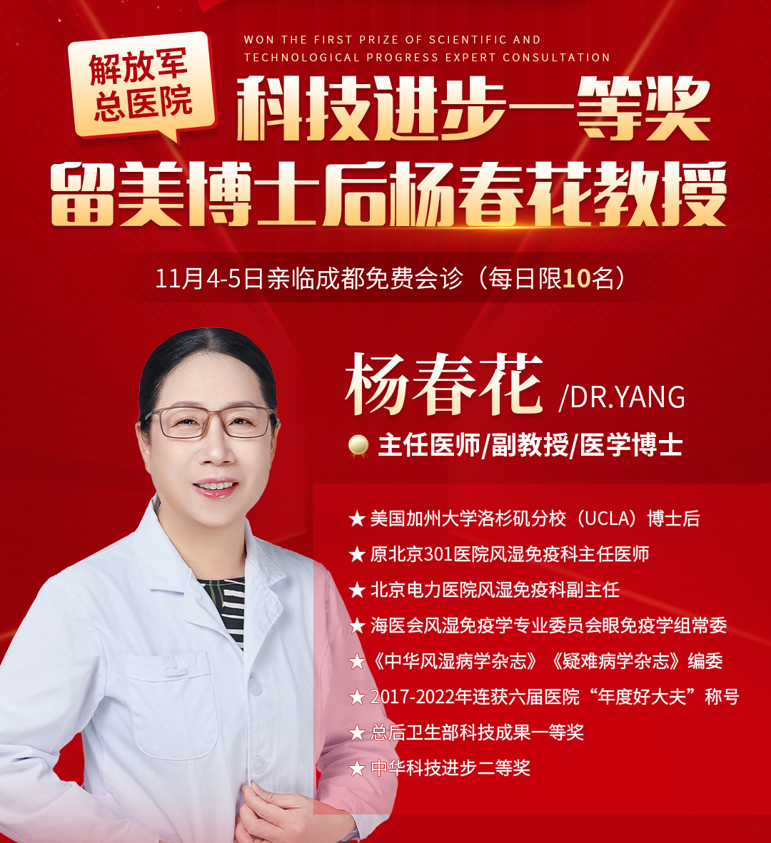 【11月4-5日】北京痛风/风湿骨病专家杨春花来蓉免费会诊,速约!